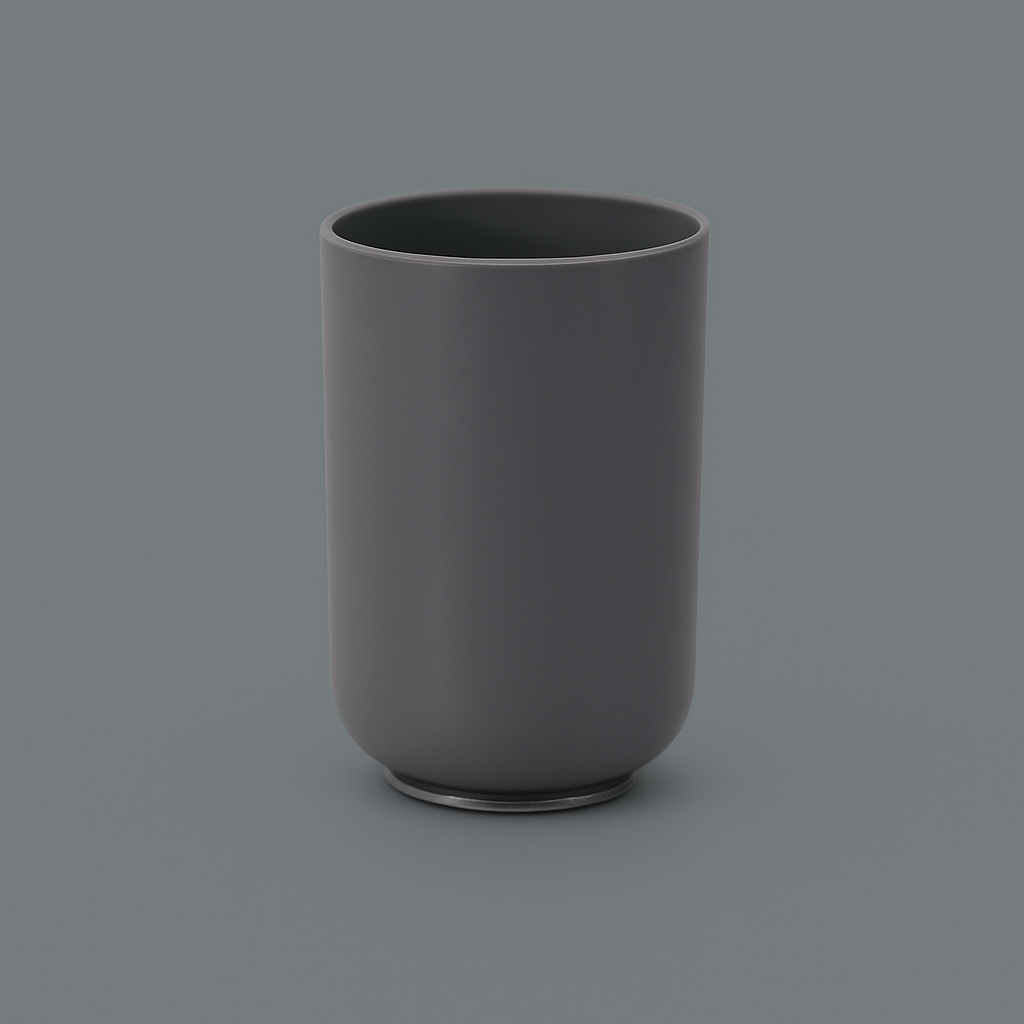 Bicchiere della serie milano, dal design essenziale e moderno, ideale come porta spazzolini o contenitore multiuso. Realizzato in materiale resistente con finitura grigio scuro, dona al bagno un tocco elegante e contemporaneo.