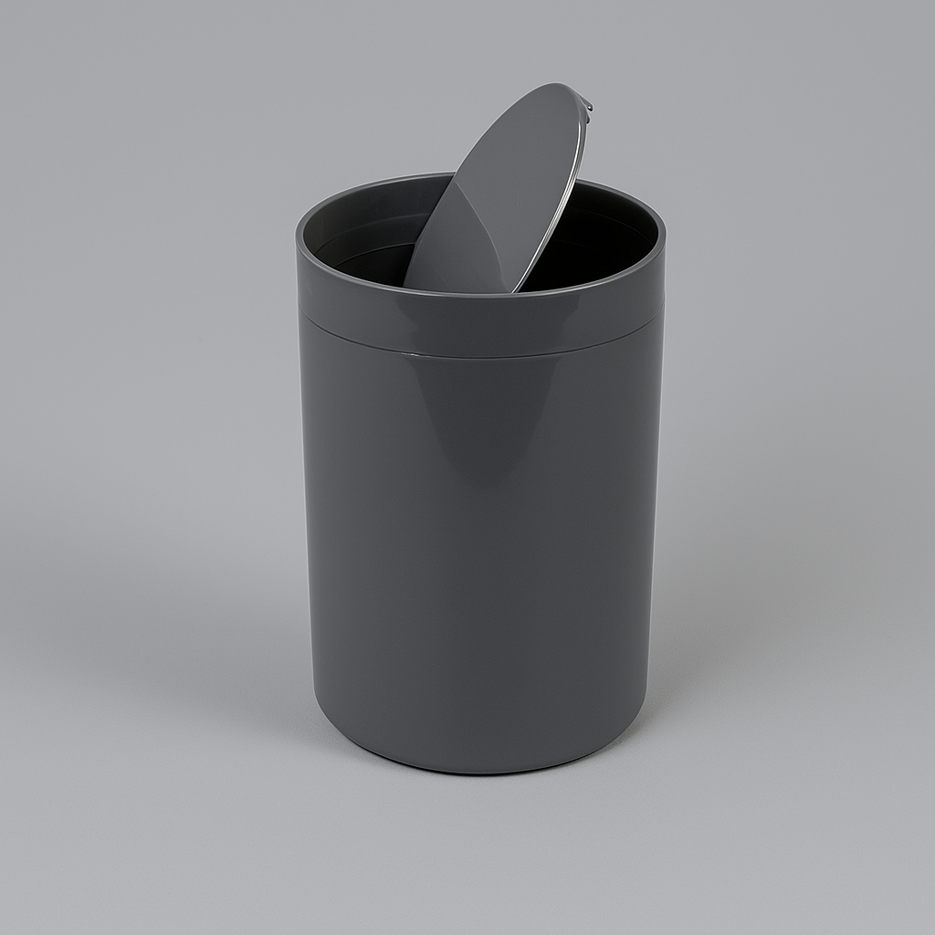Pattumiera della serie milano dal design compatto ed elegante, ideale per il bagno o piccoli ambienti. Dotata di coperchio basculante che garantisce praticità d’uso e un aspetto sempre ordinato. Realizzata in plastica resistente con finitura grigio scuro per uno stile moderno e minimal.