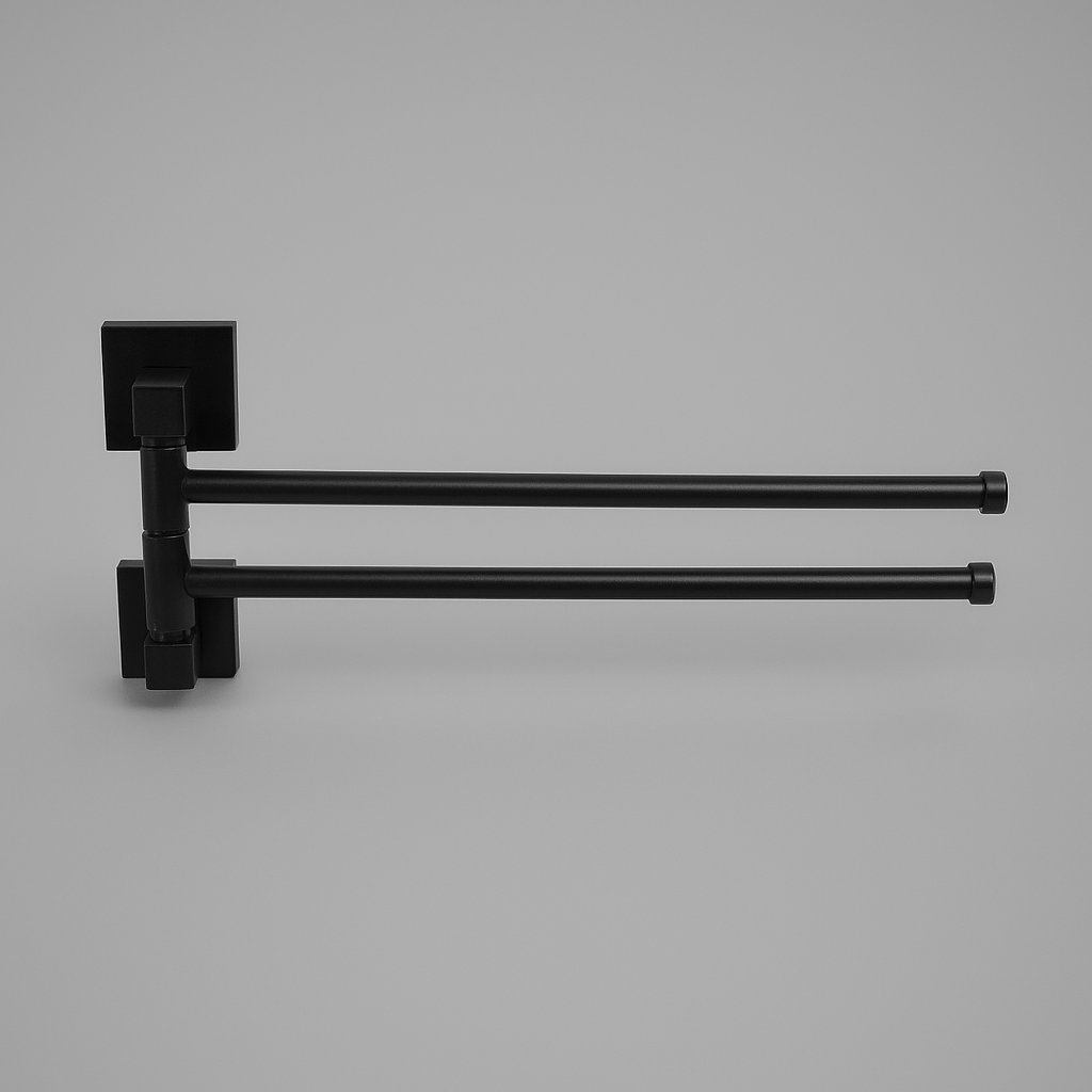 Il porta asciugamano doppio snodato in nero opaco è una soluzione elegante e pratica per il bagno. Con due bracci mobili da 36 cm, consente di appendere e tenere separati più asciugamani, mantenendo ordine e ottimizzando lo spazio.