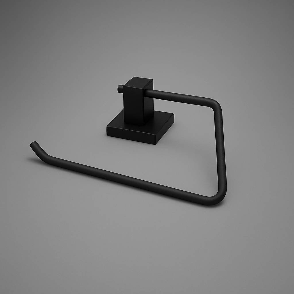 Porta asciugamano da parete in metallo con finitura nera opaca, dal design moderno e funzionale. La struttura aperta permette di appendere e rimuovere facilmente l’asciugamano, mentre il fissaggio a muro garantisce stabilità e durata nel tempo. Installazione semplice con doppio sistema: biadesivo 3M incluso o viti e tasselli.
