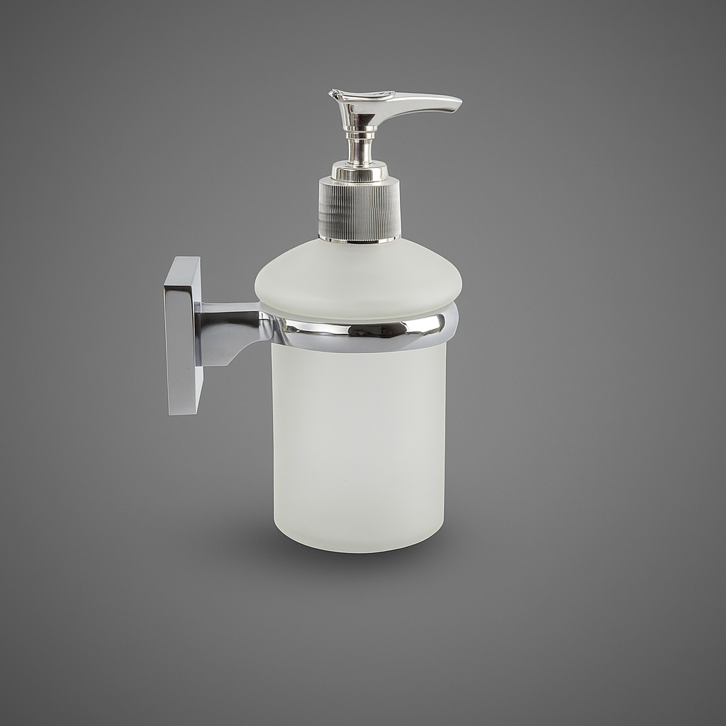 Porta sapone liquido da muro con supporto quadrato in metallo cromato e dispenser in vetro satinato. Elegante e funzionale, è ideale per mantenere il bagno ordinato e aggiungere un tocco moderno. Si installa facilmente con doppio fissaggio: biadesivo 3M incluso o viti e tasselli.