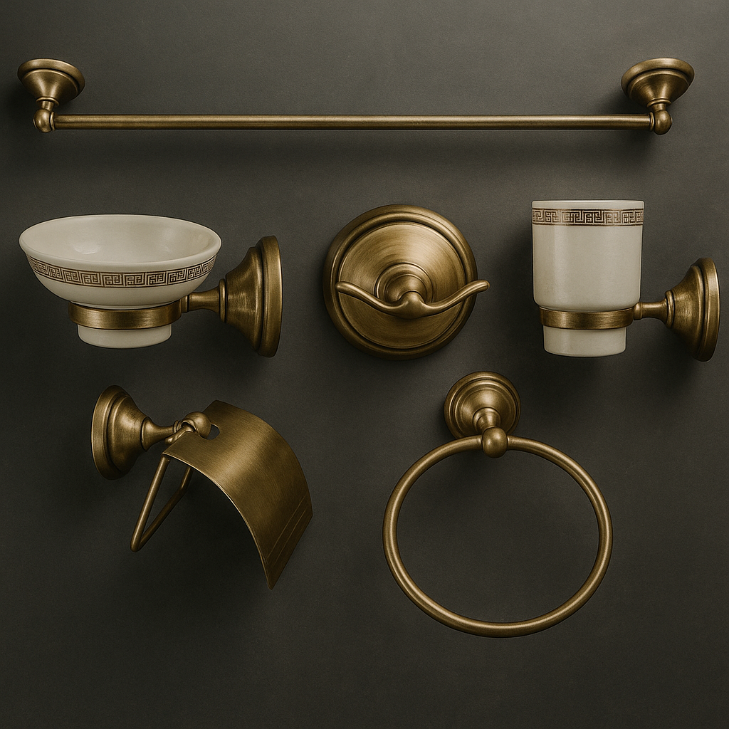 Il set bagno 6 pezzi modello 830 si distingue per il suo stile classico e raffinato, con finitura in bronzo antico e dettagli decorativi dorati. Realizzato in lega di zinco di alta qualità con inserti in ceramica bianca decorata, aggiunge un tocco vintage e sofisticato a qualsiasi ambiente bagno.