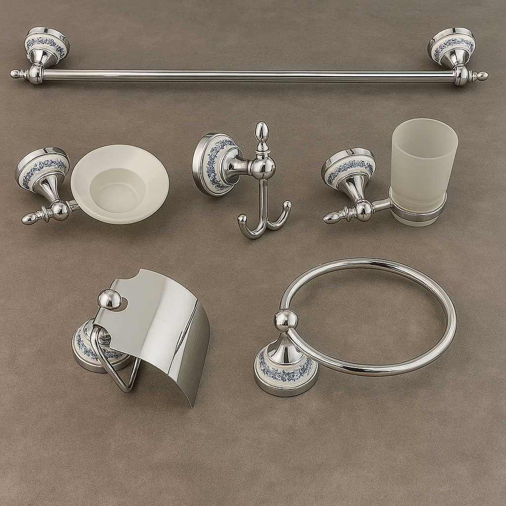 Il set bagno 6 pezzi modello 810 unisce la brillantezza della finitura cromata alla raffinatezza dei dettagli in ceramica decorata. Ideale per ambienti bagno eleganti e classici, garantisce resistenza, durata e un tocco di stile senza tempo.