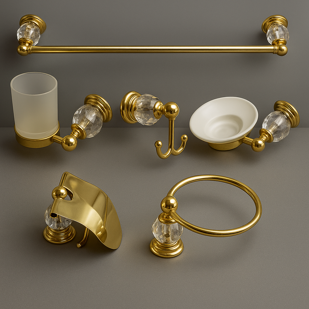 Il set bagno 6 pezzi modello 6pz presenta una raffinata finitura in oro lucido impreziosita da grandi inserti in cristallo trasparente. Perfetto per aggiungere un tocco di eleganza e luminosità a qualsiasi ambiente bagno, unisce design moderno e materiali di alta qualità.