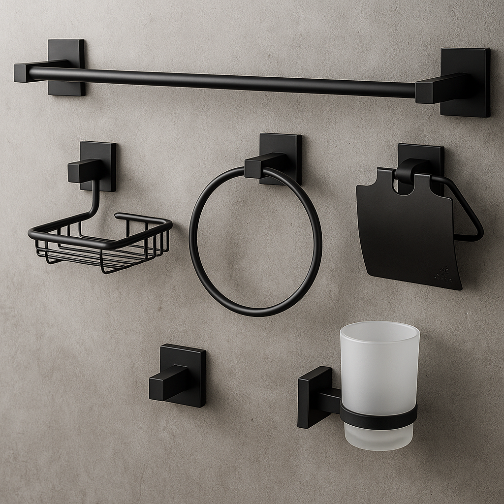 Il set bagno 6 pezzi modello 250 è realizzato con un’elegante finitura nera opaca che dona un tocco moderno e raffinato al bagno. Ogni elemento è progettato per garantire funzionalità e durata nel tempo, ideale per bagni contemporanei e minimalisti.