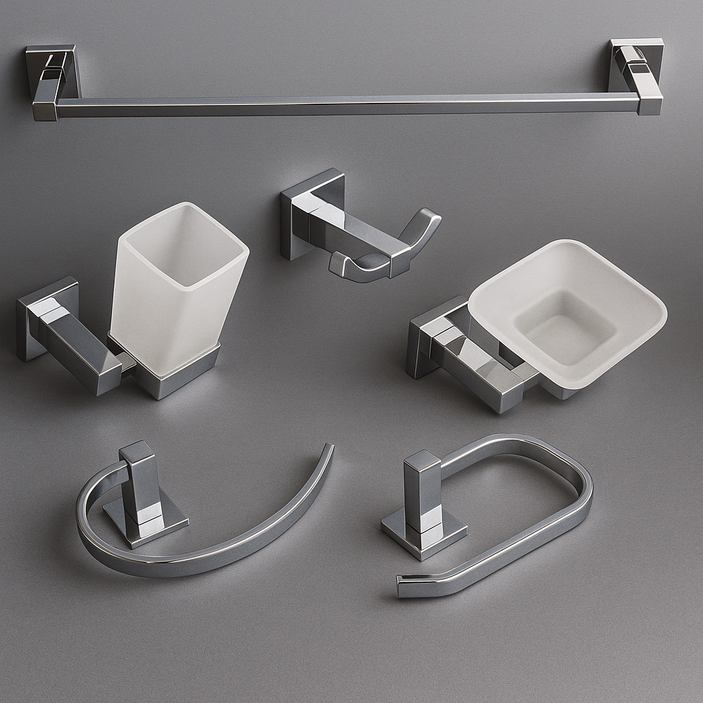 Il set bagno 6 pezzi modello 210 si distingue per il suo design moderno e geometrico con finitura cromata lucida. Un set elegante e funzionale, ideale per bagni dallo stile contemporaneo e minimalista.