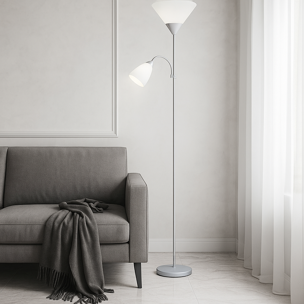 La lampada da terra E27 con doppio portalampada è la soluzione perfetta per illuminare ambienti domestici come salotti, camere o uffici. Grazie al design elegante e alla struttura in metallo, offre solidità e stile moderno in un unico prodotto.