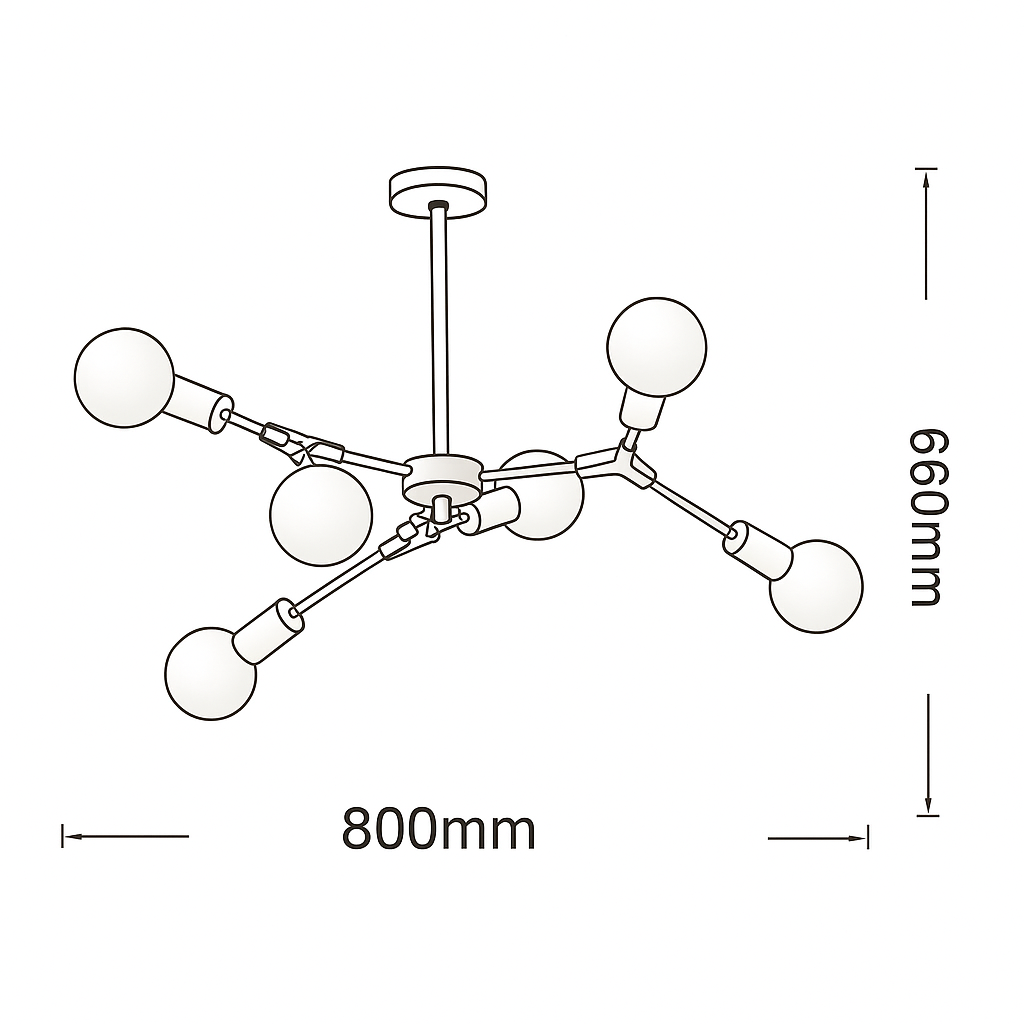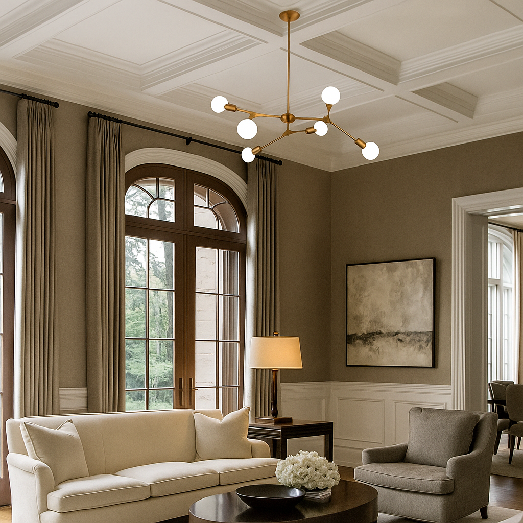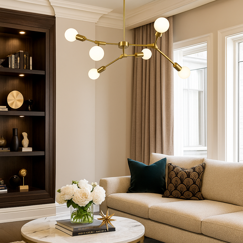 Il lampadario a sospensione 6 luci E27 è una scelta elegante e moderna per illuminare con stile ambienti ampi come salotti, sale da pranzo o studi. La struttura in metallo color bronzo dona un tocco raffinato e contemporaneo.