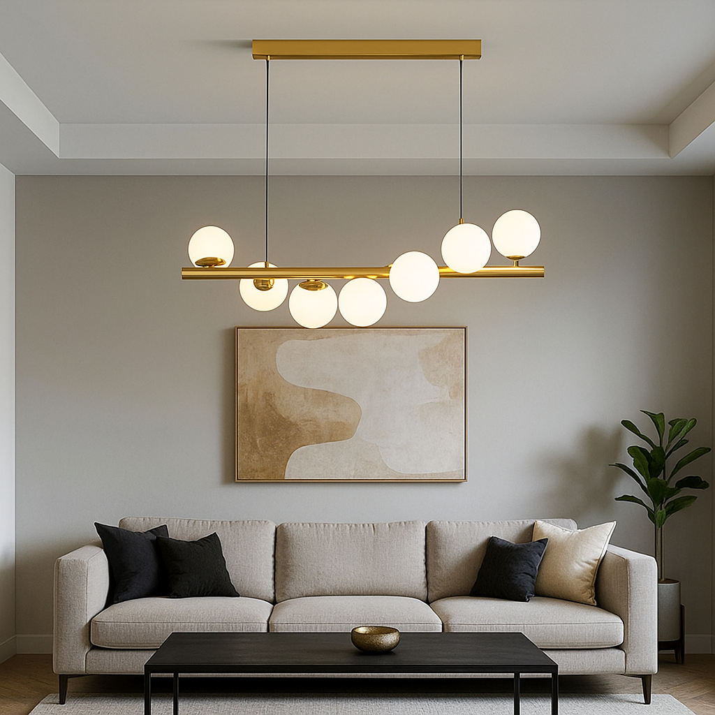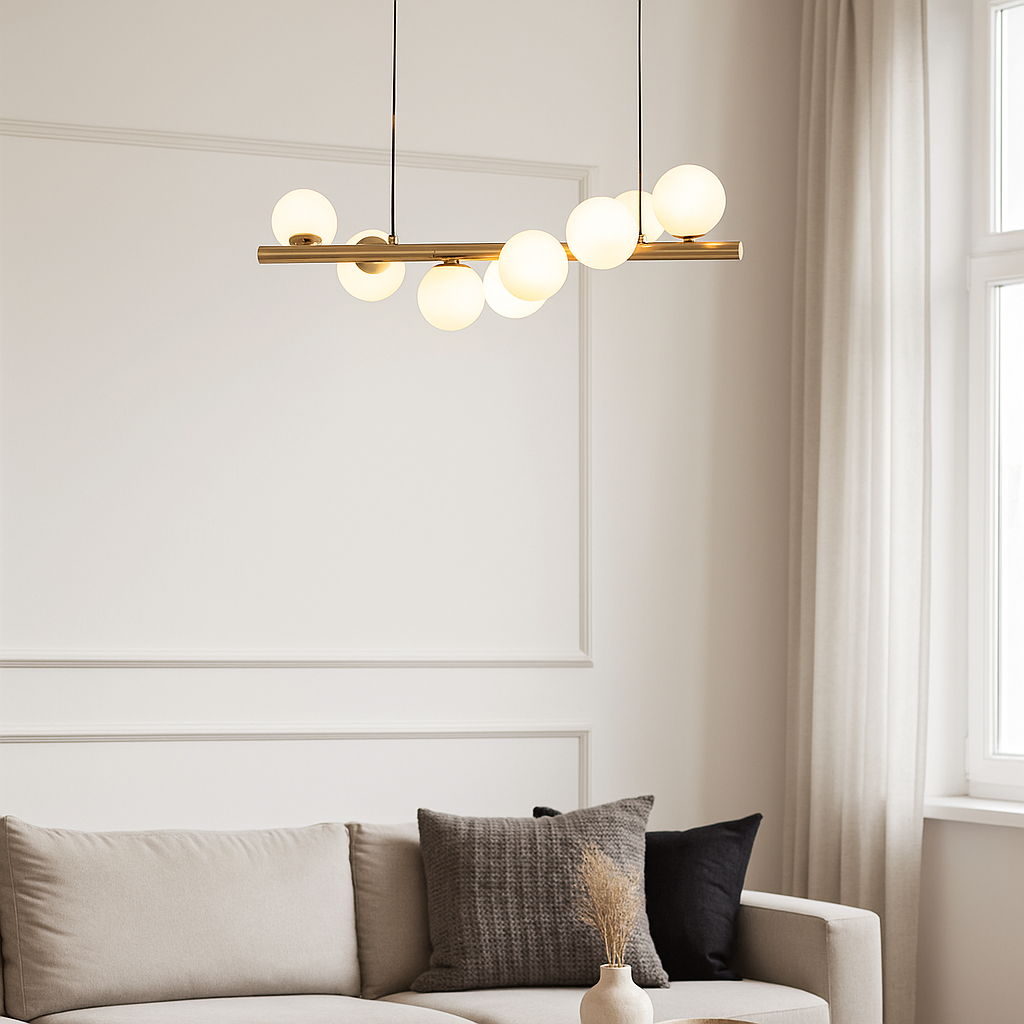 Il lampadario a sospensione 7 luci G9 è una soluzione luminosa elegante e moderna, perfetta per grandi spazi come salotti, sale da pranzo o ambienti professionali. La struttura in metallo e PE color bronzo conferisce un tocco raffinato e contemporaneo.