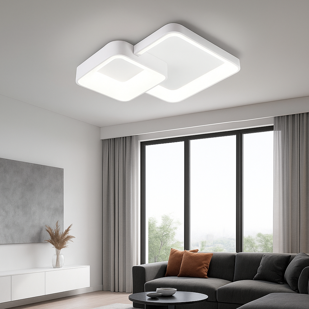 La lampada da soffitto LED Univers C59-B3C 58W unisce uno stile moderno a una tecnologia innovativa. Il design a doppio quadrato bianco la rende perfetta per ambienti eleganti e contemporanei come salotti, camere da letto, uffici e sale riunioni. Grazie alla funzione CCT con memoria, puoi selezionare e mantenere la temperatura di colore ideale tra 3000K, 4000K e 6500K, adattando la luce alle tue esigenze.