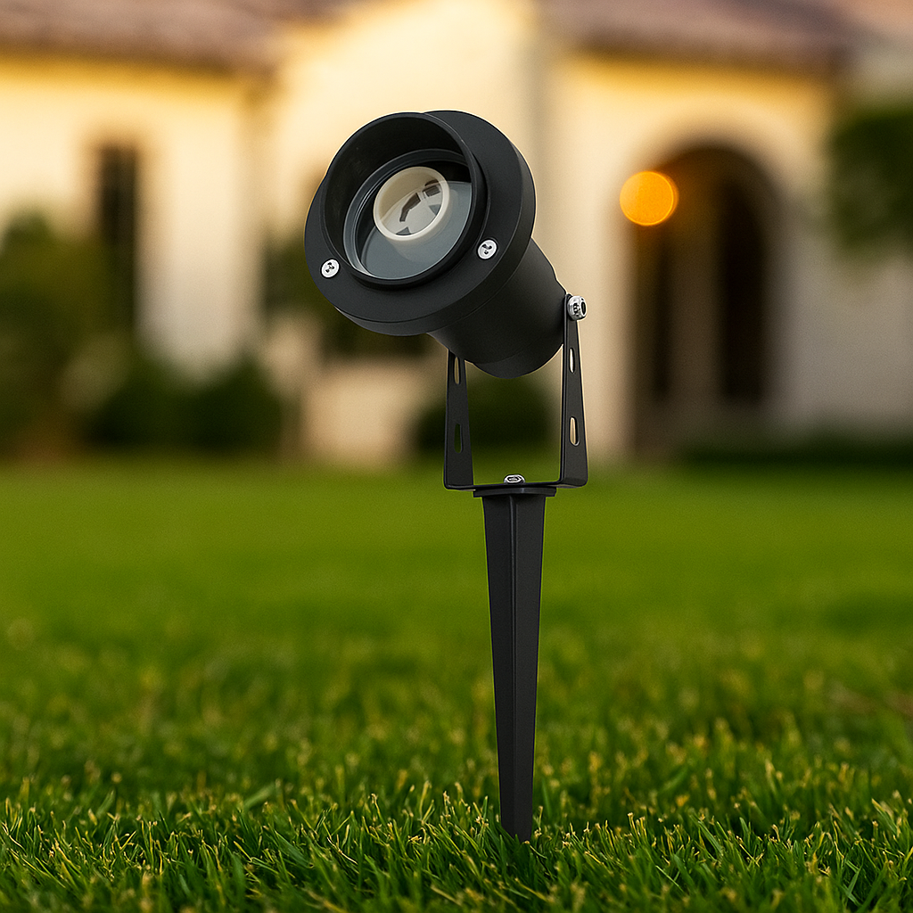 Faretto da giardino a paletto in alluminio verniciato nero con attacco lampada GU10. Ideale per vialetti, aiuole e aree esterne grazie alla protezione IP65 contro polvere e pioggia. Lampadina non inclusa (max 35 W).