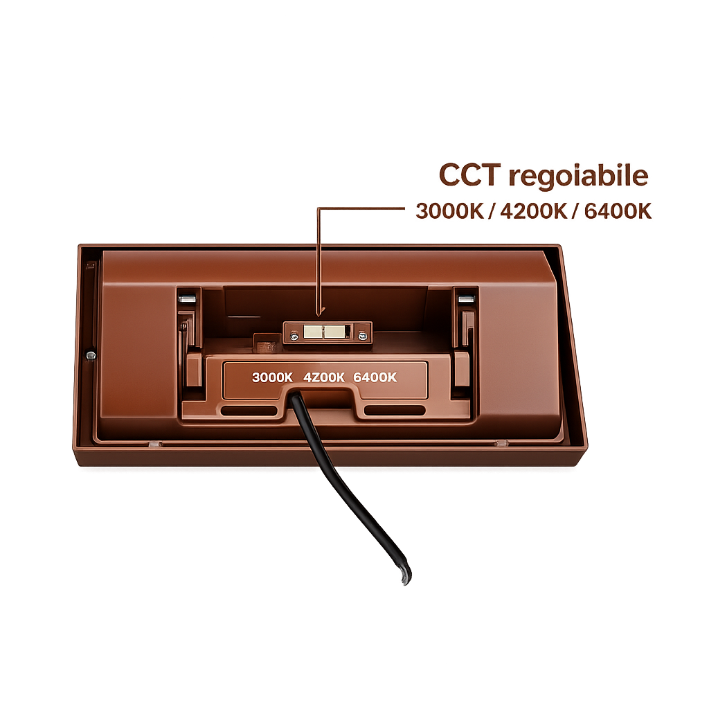 La lampada integra una potenza di 24W e dispone di tecnologia CCT selezionabile che consente di scegliere tra tre tonalità di luce: 3000K (luce calda), 4200K (luce naturale) e 6400K (luce fredda), selezionabili tramite switch interno prima dell'installazione.