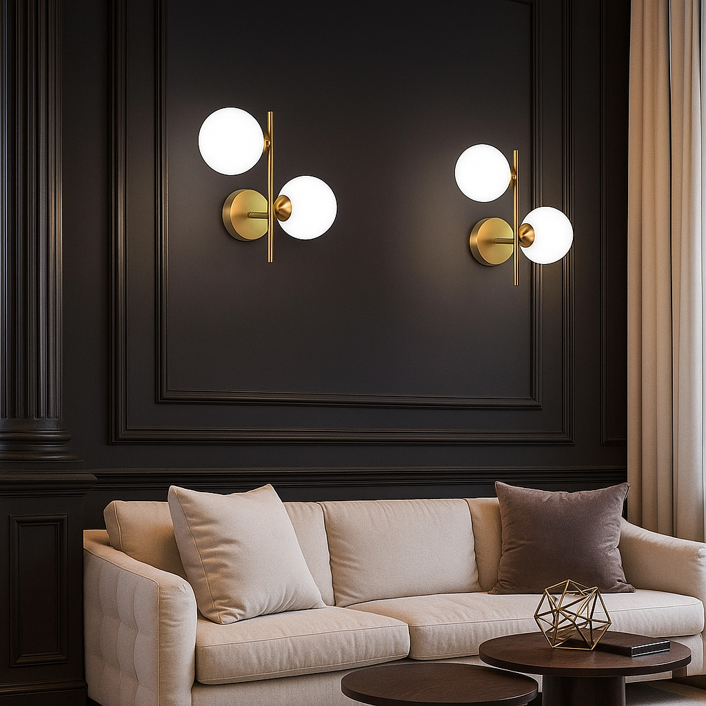 l’applique 2xg9 aq42 combina uno stile moderno e sofisticato con materiali di qualità. la struttura in metallo color ottone e le due sfere bianche satinare creano un effetto luminoso caldo e accogliente, perfetto per valorizzare pareti e spazi interni. ideale per chi cerca un punto luce decorativo capace di unire eleganza, comfort e design.
