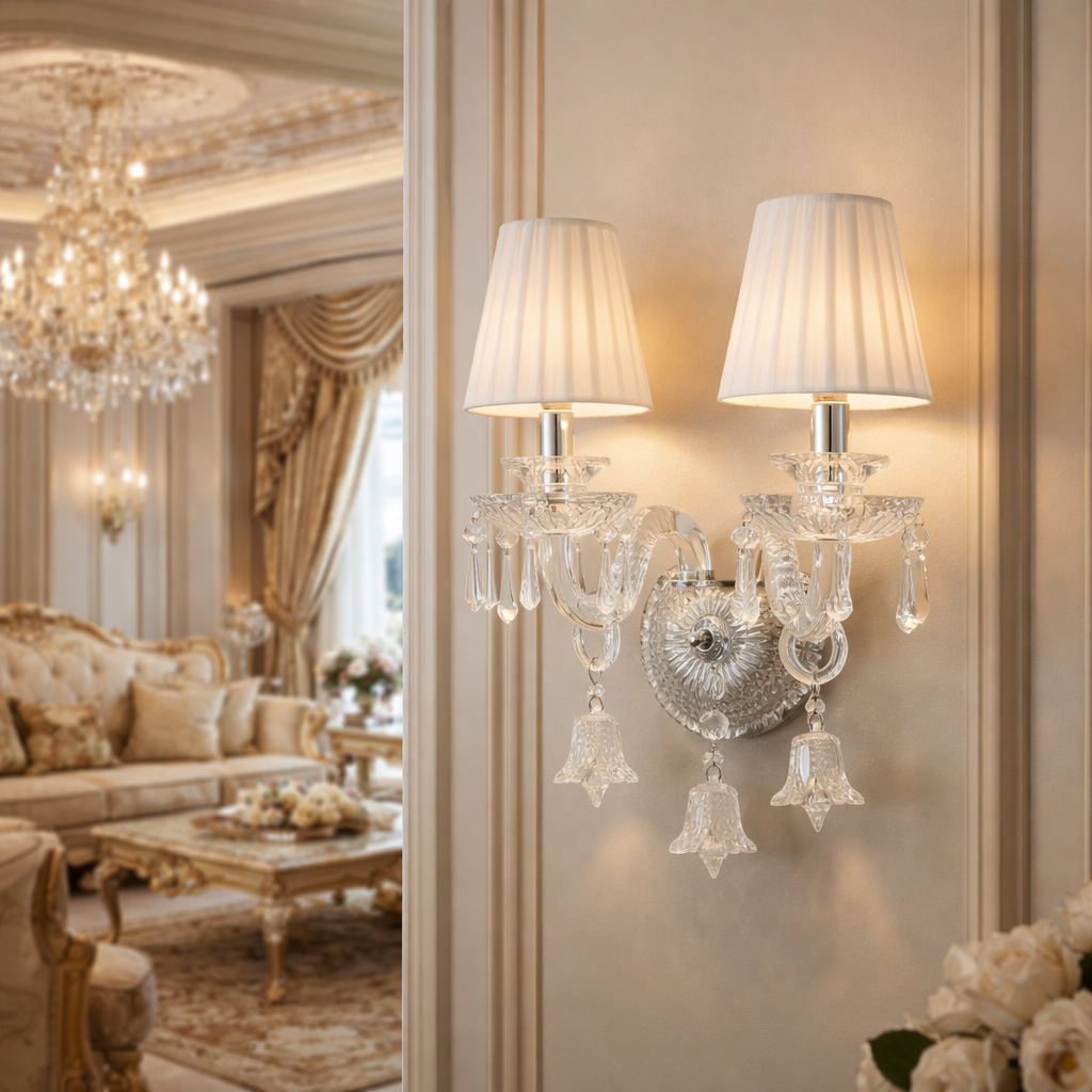 L’applique da parete a 2 luci in stile classico è una soluzione elegante e raffinata per arredare e illuminare ambienti interni. Realizzata con elementi decorativi in cristallo e paralumi in tessuto, dona un tocco di lusso e luminosità a qualsiasi spazio.