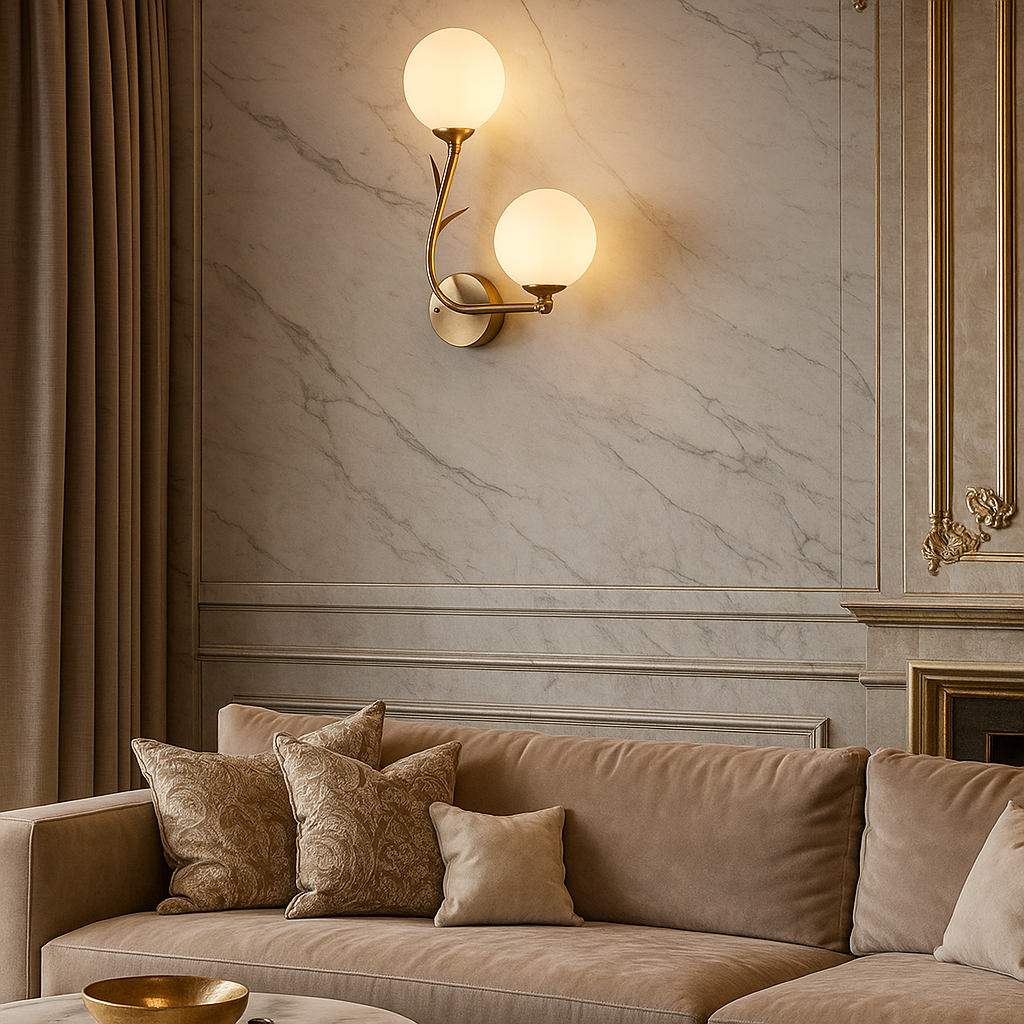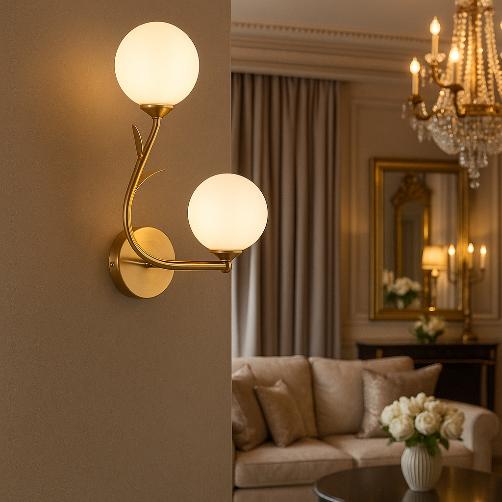L’applique da parete AQ65 è una lampada elegante e funzionale, progettata per valorizzare spazi interni con uno stile moderno e raffinato. La struttura in metallo dorato e i due diffusori sferici in vetro bianco opalino offrono un perfetto equilibrio tra design e comfort visivo.