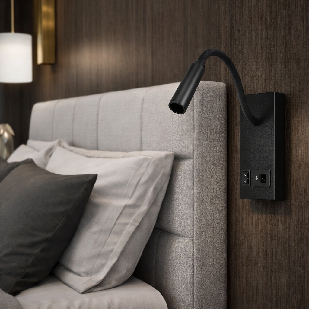 Questa applique unisce illuminazione direzionale e ricarica rapida in un unico prodotto, ideale per migliorare la praticità degli ambienti interni con un design moderno e professionale.