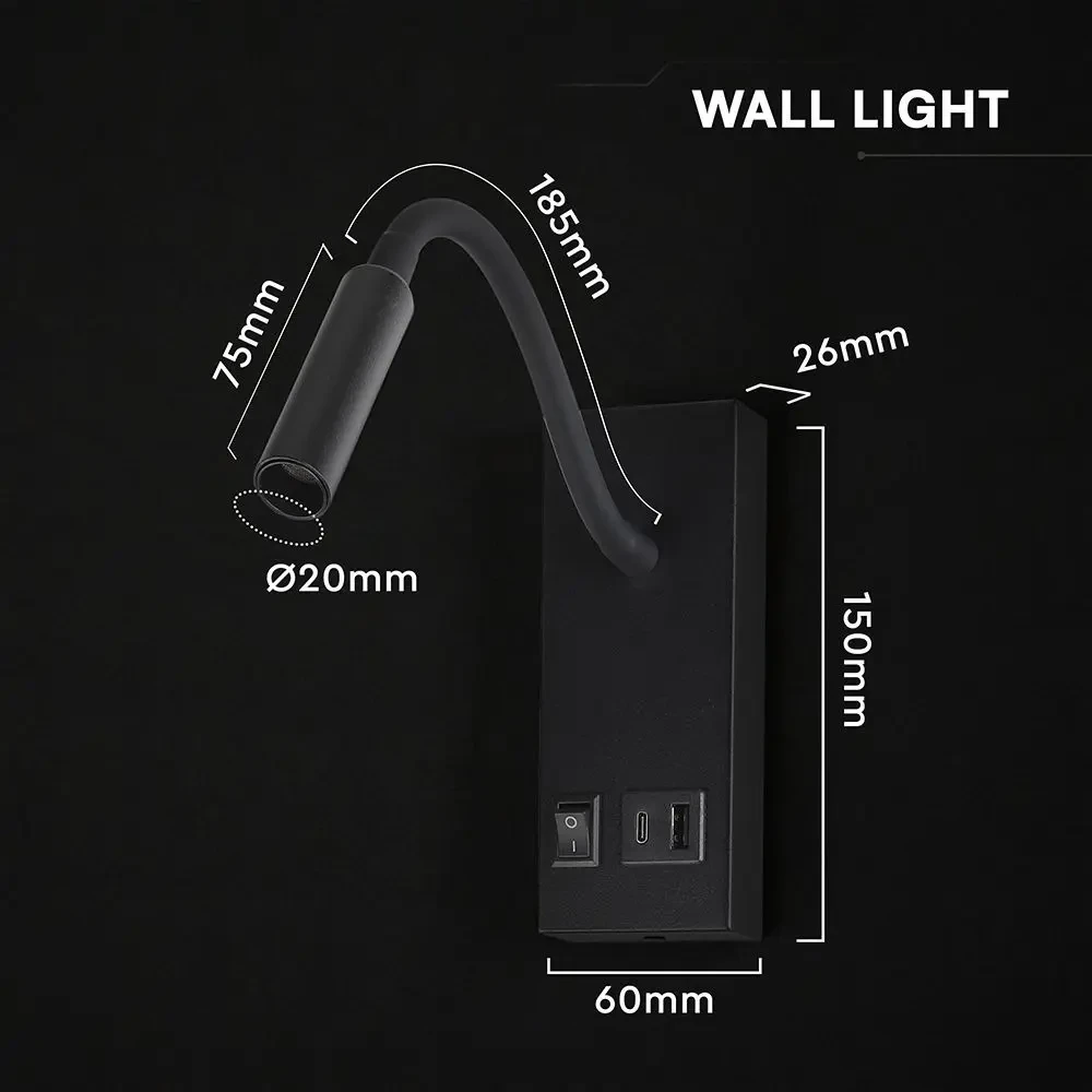 applique da parete led chip cree 3w con interruttore e usb/pd nera 3000k