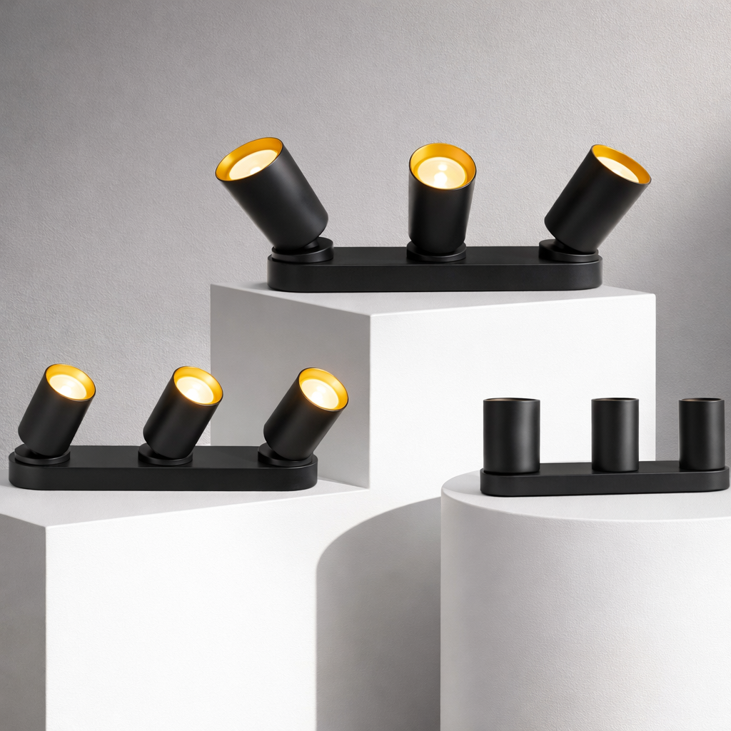 Il faretto da soffitto triplo con attacco GU10 è una soluzione moderna e altamente funzionale per l’illuminazione di ambienti interni. Grazie al design lineare e alla finitura nero e gold, si integra perfettamente in contesti contemporanei, risultando ideale per soggiorni, cucine, corridoi, uffici e spazi commerciali.