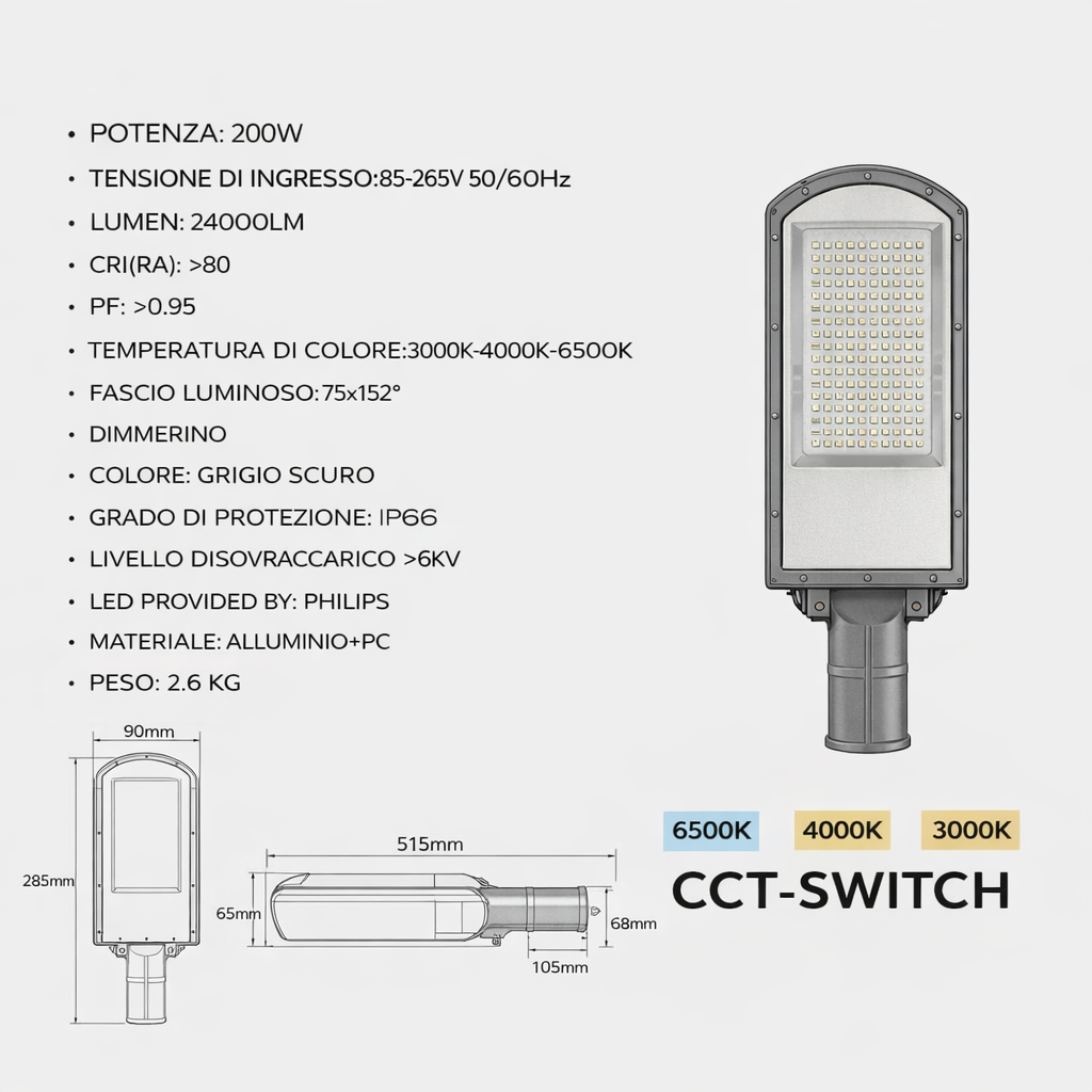 lampione stradale led 200w ip66 cct regolabile a 3 colori luce