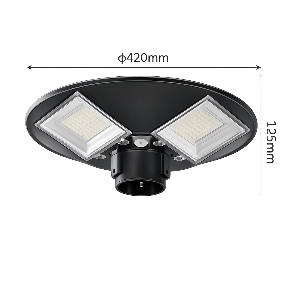 Grazie al grado di protezione IP65, il lampione è progettato per resistere agli agenti atmosferici ed è adatto all'uso esterno. La struttura compatta con diametro di circa 420 mm e altezza di circa 123 mm lo rende una soluzione pratica e funzionale per diverse installazioni.