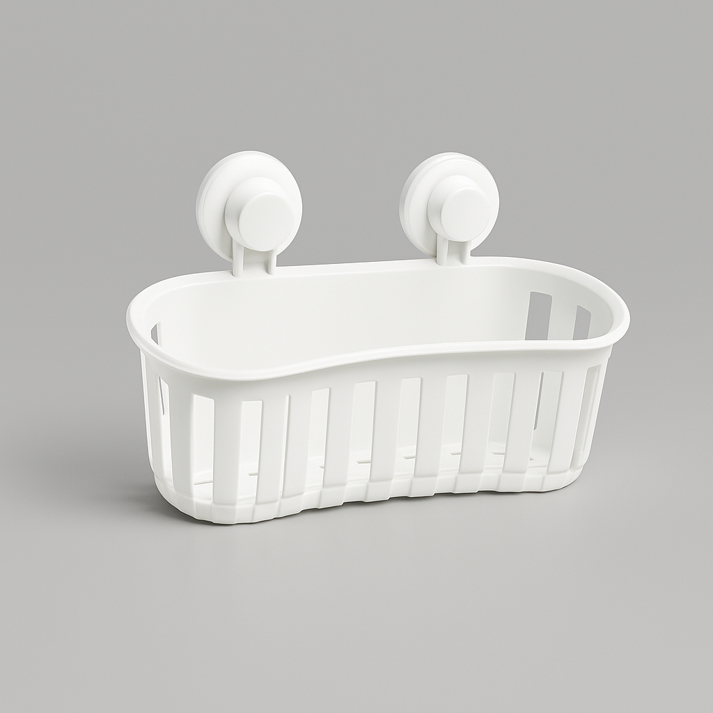 Cesto portaoggetti con fissaggio a ventosa, ideale per bagno, cucina o lavanderia. Design ampio e traforato che favorisce il drenaggio dell’acqua, perfetto per contenere shampoo, bagnoschiuma e accessori.