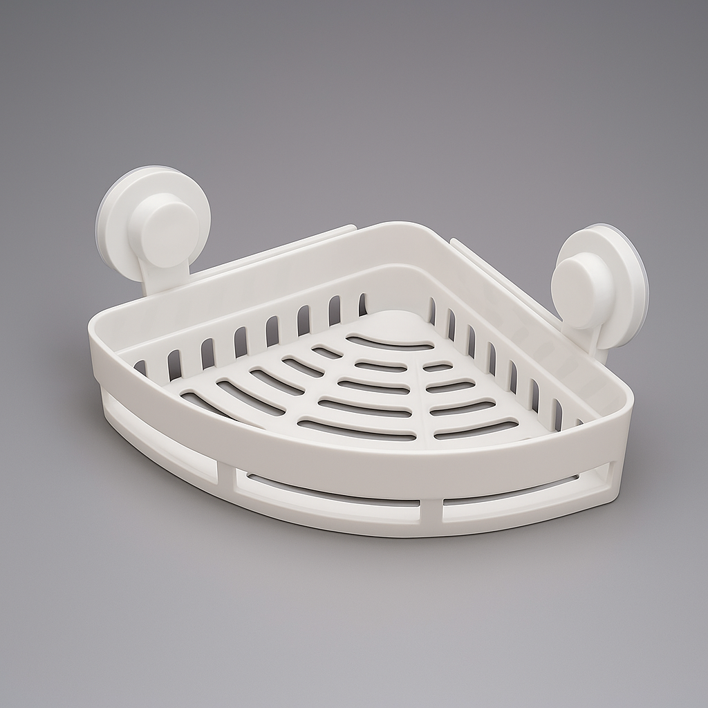 Mensola angolare con fissaggio a ventosa, ideale per ottimizzare lo spazio in bagno o cucina. Perfetta per riporre shampoo, bagnoschiuma, saponi e accessori da tenere sempre a portata di mano.