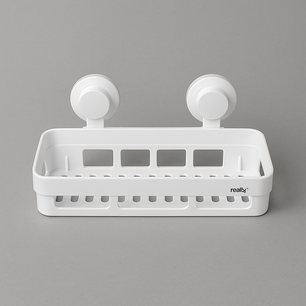 Mensola rettangolare con fissaggio a ventosa, ideale per bagno e cucina. Pratica per contenere saponi, shampoo, spugne o piccoli oggetti senza bisogno di trapano o viti.