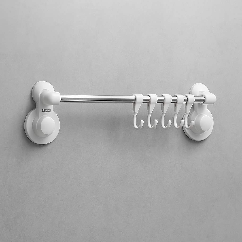 Porta asciugamani con barra da 42 cm e 6 ganci mobili, fissaggio a ventosa senza trapano. Ideale per appendere salviette, accessori da bagno o piccoli oggetti in modo ordinato.