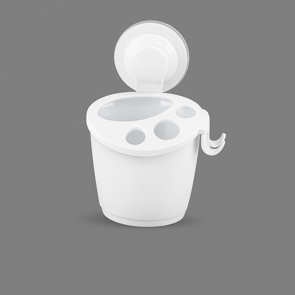 Portaspazzolino con fissaggio a ventosa, pratico e compatto, ideale per mantenere ordinati spazzolini e dentifricio senza forare le pareti. Si installa facilmente su superfici lisce e pulite, resistente all’umidità.