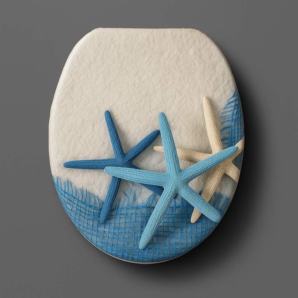 Copri water universale 19” decorato con stelle marine blu e bianche su sfondo sabbia. Realizzato in MDF resistente con superficie liscia e brillante, dona al bagno un tocco marino elegante e raffinato. Le cerniere regolabili cromate garantiscono stabilità, durata e compatibilità con la maggior parte dei WC standard.