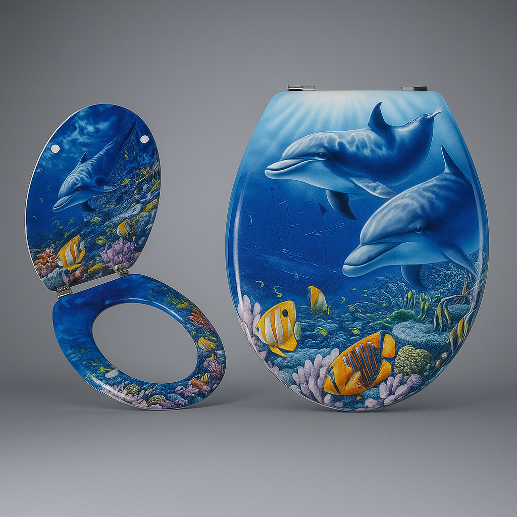 Copri water universale modello P-2960A con suggestivo decoro a tema marino: delfini, pesci tropicali e barriera corallina. Realizzato in MDF robusto e resistente, con cerniere cromate regolabili, si adatta facilmente alla maggior parte dei WC standard. Un accessorio funzionale e al tempo stesso decorativo, perfetto per chi desidera arredare il bagno con stile e colore.