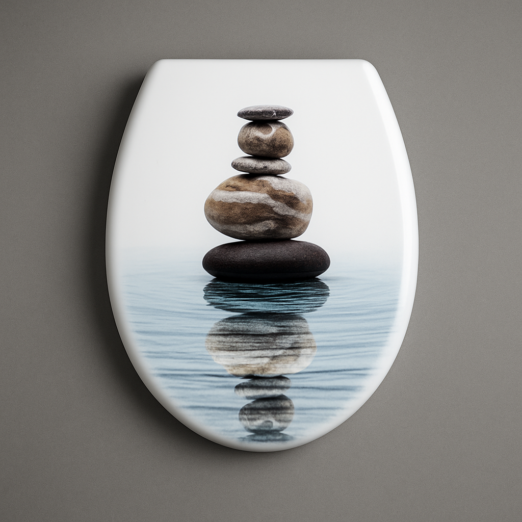 Copri water universale modello P-3114 con decoro Zen raffigurante pietre impilate in equilibrio sull’acqua. Realizzato in MDF resistente con finitura lucida, unisce praticità e design raffinato. Le cerniere cromate regolabili garantiscono facilità di montaggio e adattabilità alla maggior parte dei WC standard. Perfetto per chi desidera trasformare il bagno in un ambiente elegante e rilassante.