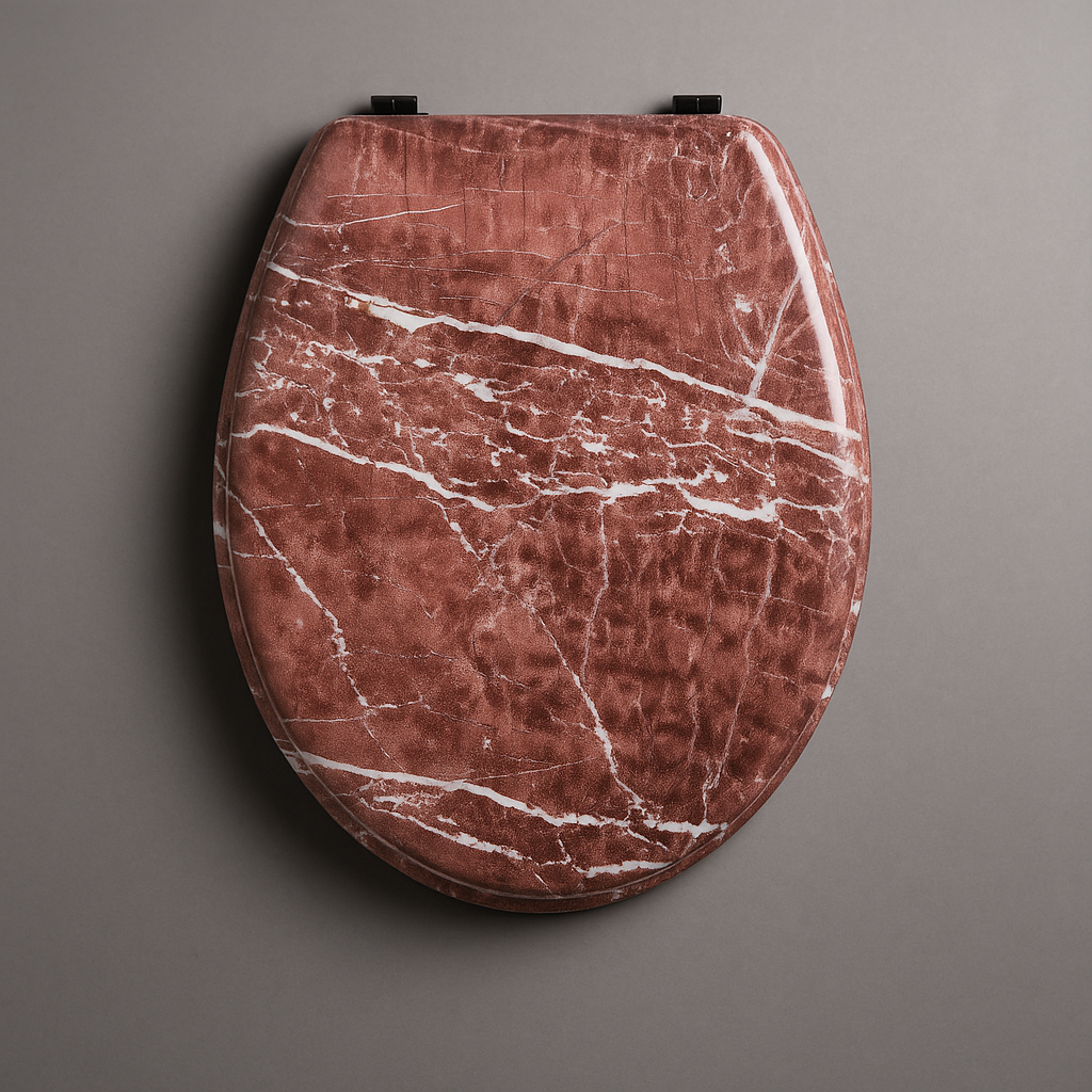 Copri water universale modello P-2968A con raffinata finitura effetto marmo rosso venato. Realizzato in MDF di alta qualità, offre resistenza, stabilità e un design unico. Le cerniere cromate regolabili garantiscono compatibilità con la maggior parte dei WC standard e una facile installazione. Perfetto per chi desidera arricchire il bagno con un dettaglio di lusso e carattere.