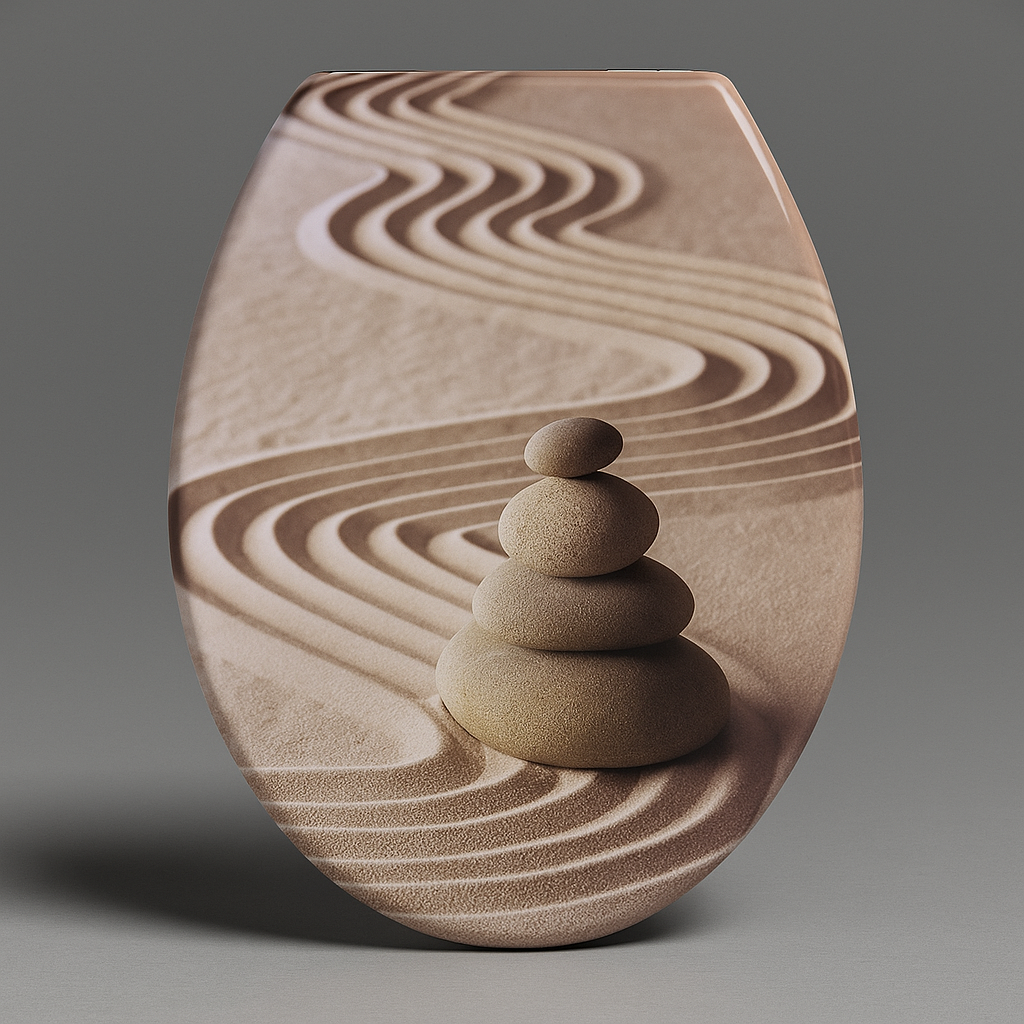 Copri water universale con design Zen, caratterizzato da una stampa di sassi su sabbia che richiama armonia e relax. Realizzato in materiale resistente, si adatta facilmente alla maggior parte dei WC standard ed è dotato di cerniere robuste per un fissaggio stabile. Un accessorio che unisce funzionalità e stile, perfetto per donare al bagno un tocco elegante e originale.