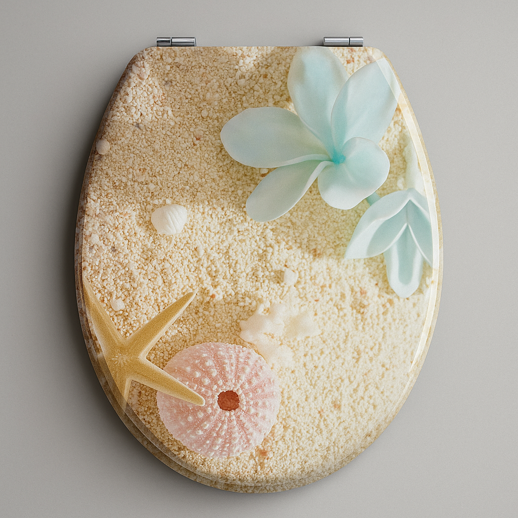 Copri water universale modello P-1090 con decorazione in stile marino: sabbia, conchiglie, una stella marina e dettagli floreali che donano un effetto naturale ed elegante. Realizzato in MDF robusto, con superficie liscia e lucida, è facile da pulire e molto resistente. Le cerniere cromate regolabili assicurano compatibilità con la maggior parte dei WC standard. Perfetto per arricchire il bagno con un tocco fresco e originale.