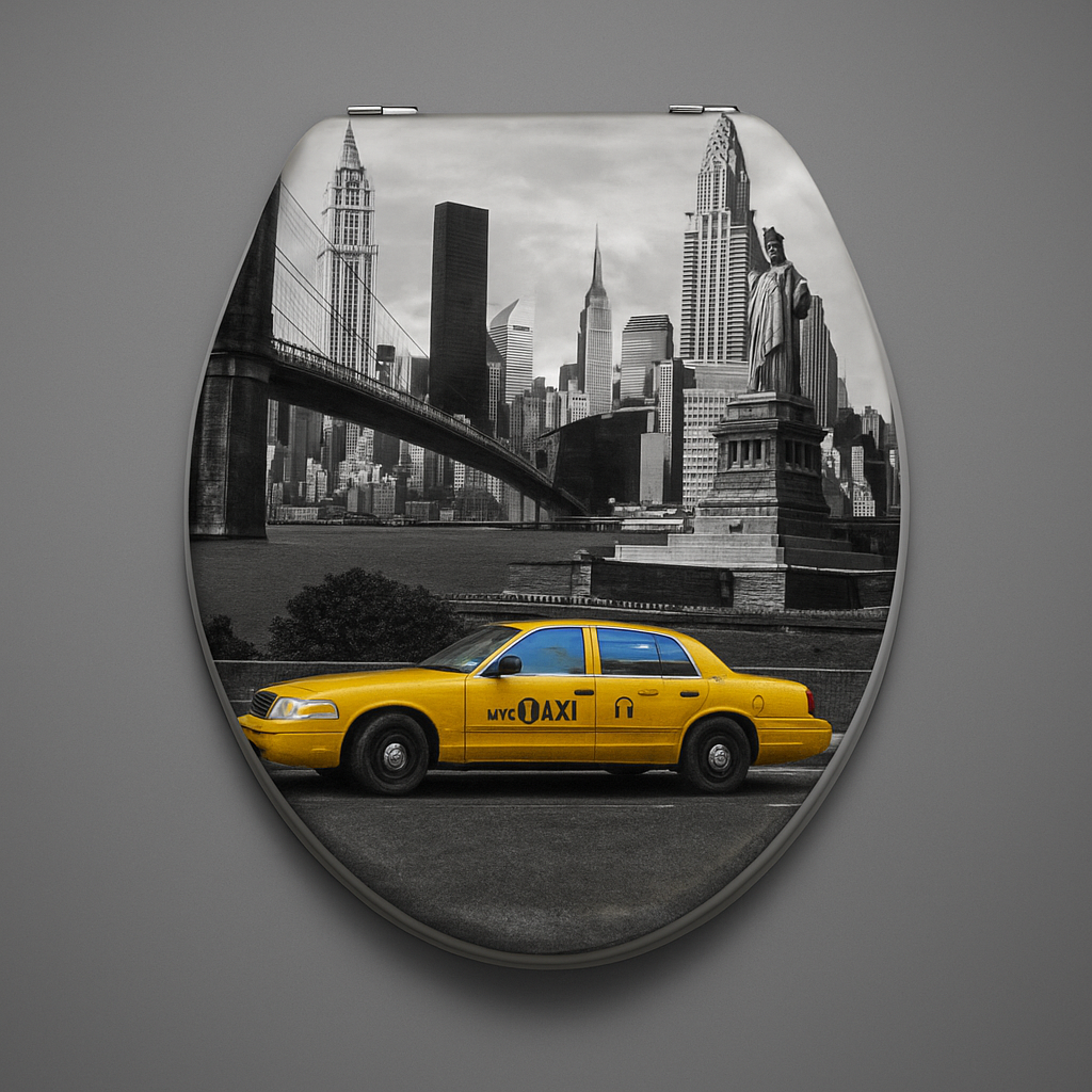 Copri water universale modello P-2001 con grafica esclusiva Taxi di New York. Realizzato in MDF resistente e dotato di cerniere cromate regolabili, unisce solidità e praticità con uno stile originale. Ideale per chi ama l’atmosfera metropolitana e vuole personalizzare il bagno con un tocco urban unico.