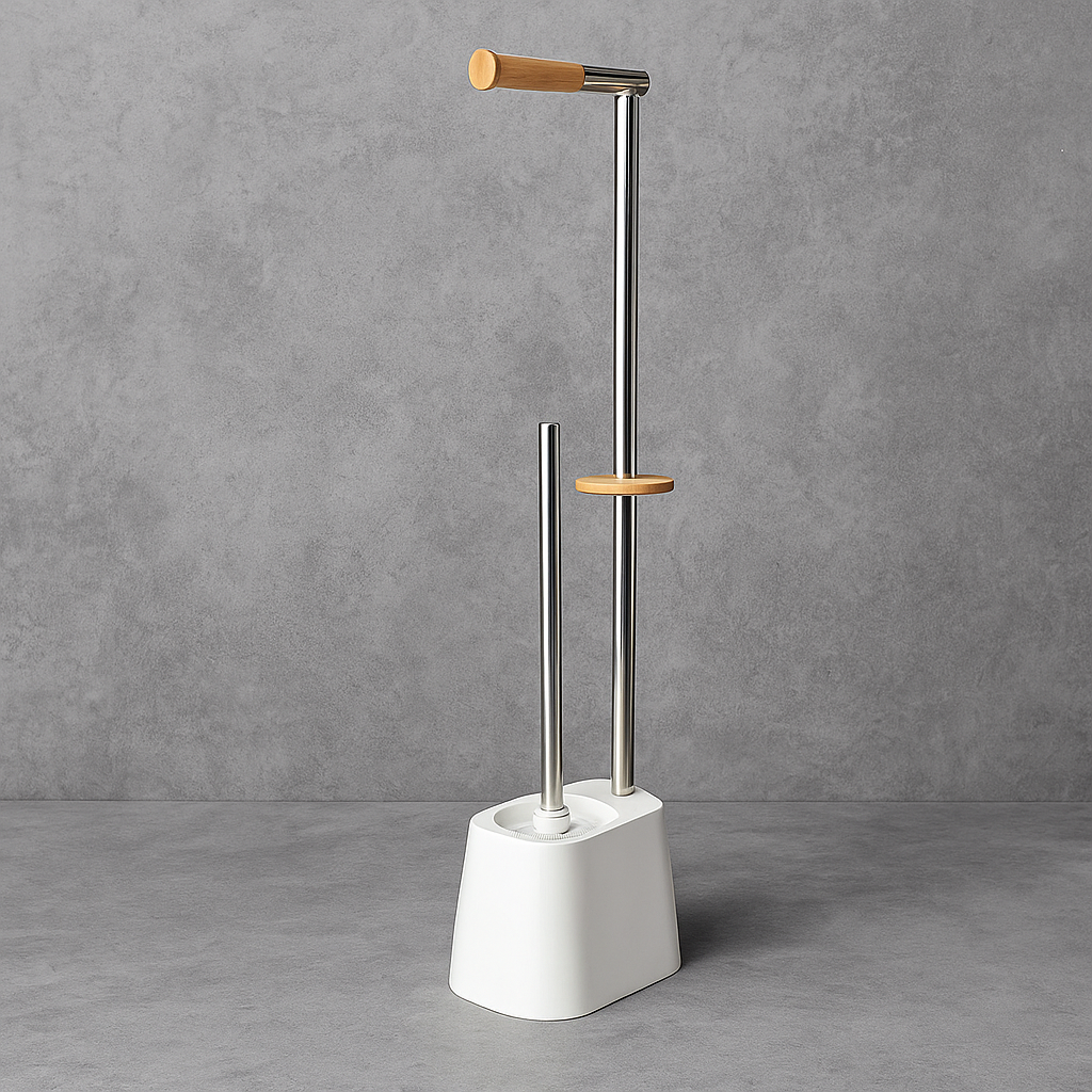 La piantana porta rotolo e porta scopino wc modello 87748 unisce eleganza naturale e praticità moderna. Realizzata in acciaio inox con dettagli in legno chiaro, offre una soluzione completa e raffinata per mantenere ordine e stile all’interno del bagno. Il suo design minimale e armonioso la rende adatta a qualsiasi tipo di arredamento.