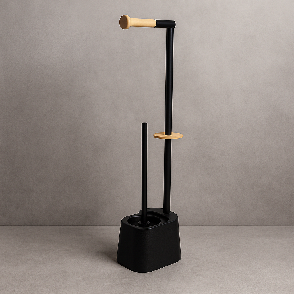 La piantana porta rotolo e porta scopino wc modello 87749 è un accessorio elegante e funzionale che unisce praticità e design contemporaneo. Realizzata in acciaio verniciato nero con dettagli in legno naturale, si distingue per il suo stile moderno e minimalista, perfetto per arredare con gusto qualsiasi bagno.