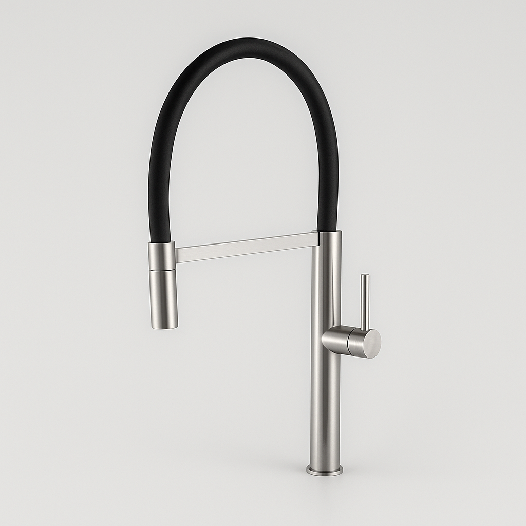 Il miscelatore per cucina satinato con tubo flessibile nero unisce design moderno e massima funzionalità. La finitura satinata lo rende elegante e resistente, mentre il tubo in silicone nero flessibile consente di orientare il getto d’acqua in ogni direzione, semplificando le operazioni di lavaggio. Dotato di testa a due fasi e miscelatore girevole, offre praticità quotidiana. L’aeratore anticalcare garantisce lunga durata e minore manutenzione, mentre il sistema di risparmio idrico aiuta a ottimizzare i consumi.