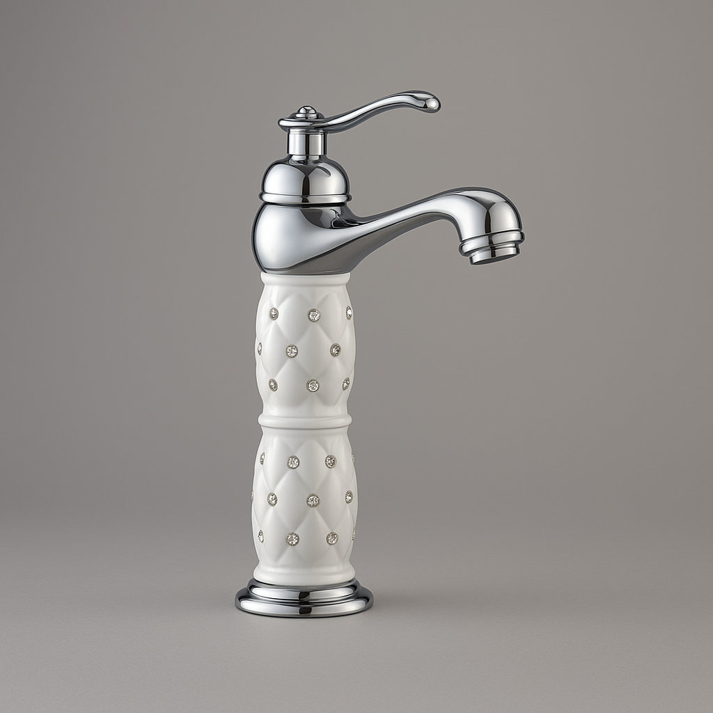 Il miscelatore per lavabo alto Diamante Argento è un modello elegante e raffinato, perfetto per valorizzare ambienti bagno moderni e classici. La finitura in argento con corpo decorato effetto ceramica impreziosito da dettagli brillanti, unisce lusso e funzionalità. È dotato di testa a due fasi per un controllo preciso del flusso e della temperatura dell’acqua e di un miscelatore girevole per maggiore praticità. L’aeratore anticalcare assicura resistenza e manutenzione ridotta, mentre il sistema integrato permette un notevole risparmio idrico.