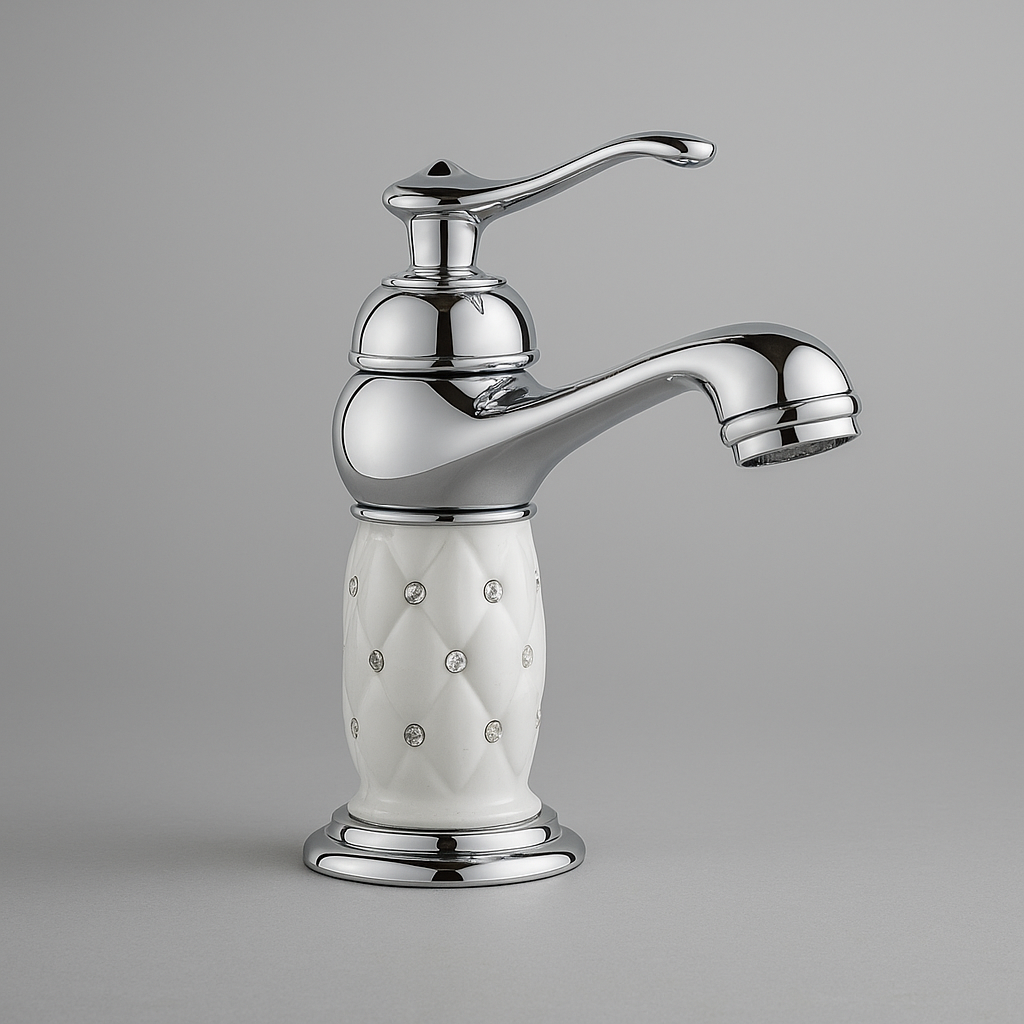 Il miscelatore per lavabo Diamante Argento è caratterizzato da un design elegante e ricercato che unisce stile e funzionalità. La finitura in argento con corpo decorato effetto ceramica arricchito da dettagli brillanti lo rende ideale per bagni moderni e raffinati. È dotato di testa a due fasi per un controllo preciso del flusso e della temperatura dell’acqua e di un miscelatore girevole per maggiore comodità. L’aeratore anticalcare assicura resistenza e ridotta manutenzione, mentre il sistema integrato garantisce un notevole risparmio idrico.