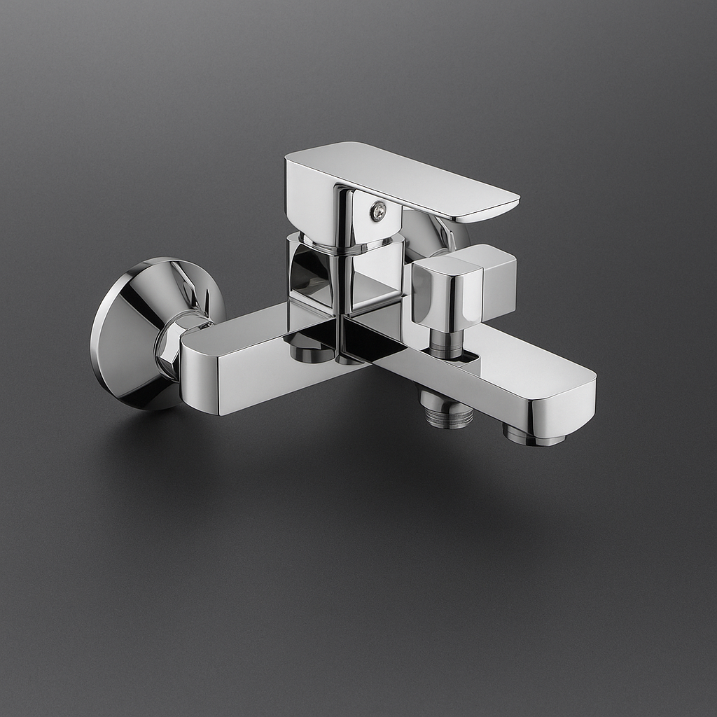 Il miscelatore per vasca serie Shape è realizzato in ottone cromato con design moderno e linee squadrate. È dotato di aeratore anticalcare e sistema di risparmio idrico, offrendo comfort e durata nel tempo.