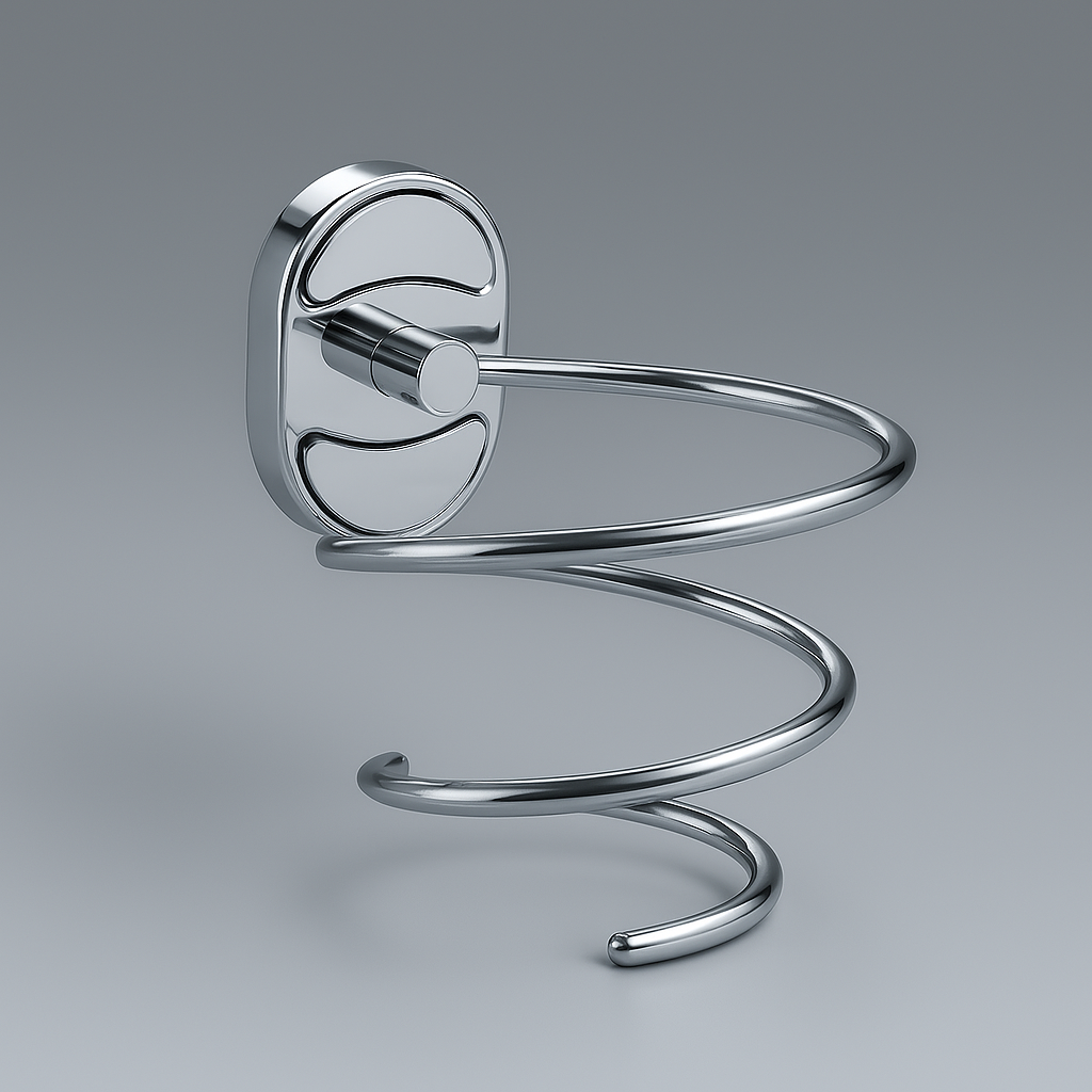 Porta phon da parete in metallo cromato, pratico e resistente. Il design a spirale consente di inserire e rimuovere facilmente l’asciugacapelli, mantenendolo sempre a portata di mano. Soluzione salvaspazio ideale per bagni moderni.