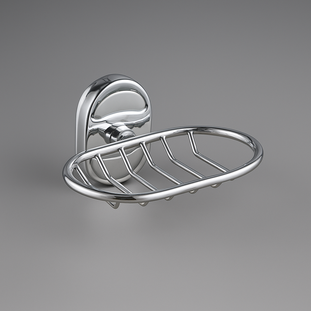 Porta sapone da parete con struttura a griglia in metallo cromato. Design pratico che permette all’acqua di defluire, mantenendo il sapone sempre asciutto e durevole. Un accessorio elegante e funzionale per ogni bagno moderno.