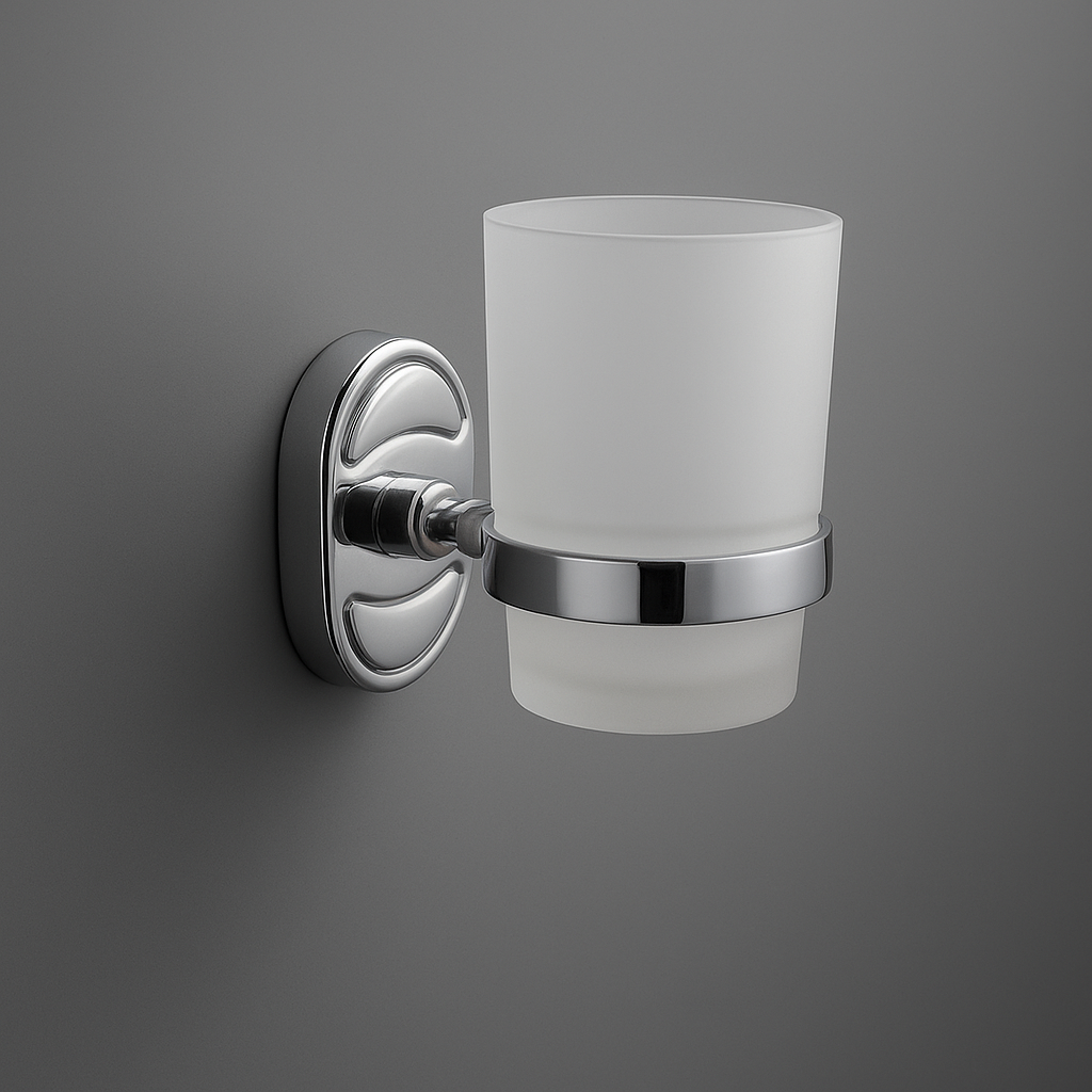 Porta spazzolini da parete pratico ed elegante, ideale per mantenere in ordine il bagno. Realizzato con bicchiere in vetro satinato e supporto in metallo cromato, è resistente e facile da pulire.