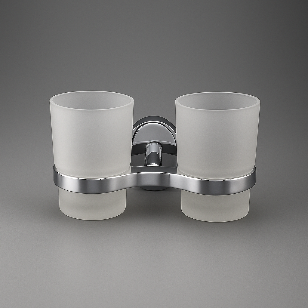 Porta spazzolini da parete con doppio bicchiere, ideale per famiglie o coppie. Realizzato con due bicchieri in vetro satinato e supporto in metallo cromato, unisce design elegante e massima praticità.