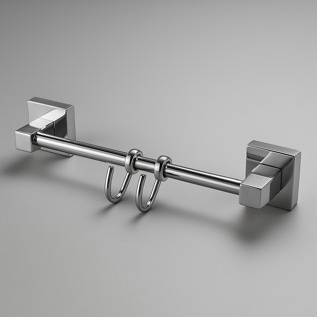 Appendino da muro con supporti quadrati in metallo cromato e barra centrale con ganci mobili. Ideale per appendere asciugamani, accappatoi o accessori da bagno, unendo praticità e design moderno. Installazione semplice e sicura grazie al doppio fissaggio: biadesivo 3M incluso oppure viti e tasselli.