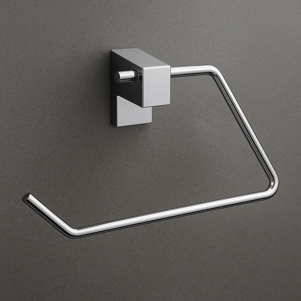 Porta asciugamano da parete in metallo cromato con design quadrato moderno. La sua struttura pratica e robusta permette di appendere asciugamani mantenendoli ordinati e facilmente accessibili. Dotato di doppio fissaggio: con viti incluse oppure biadesivo 3M, per garantire massima stabilità e facilità di installazione.