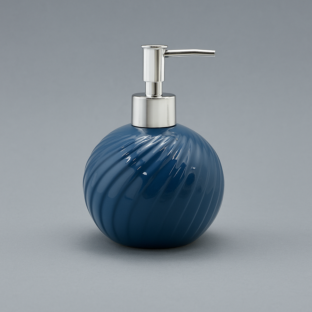 Elegante dispenser per sapone in ceramica a forma sferica con lavorazione a rilievo e finitura blu lucida. Dotato di pompa cromata resistente, garantisce un’erogazione fluida e un tocco di stile raffinato per bagno e cucina.