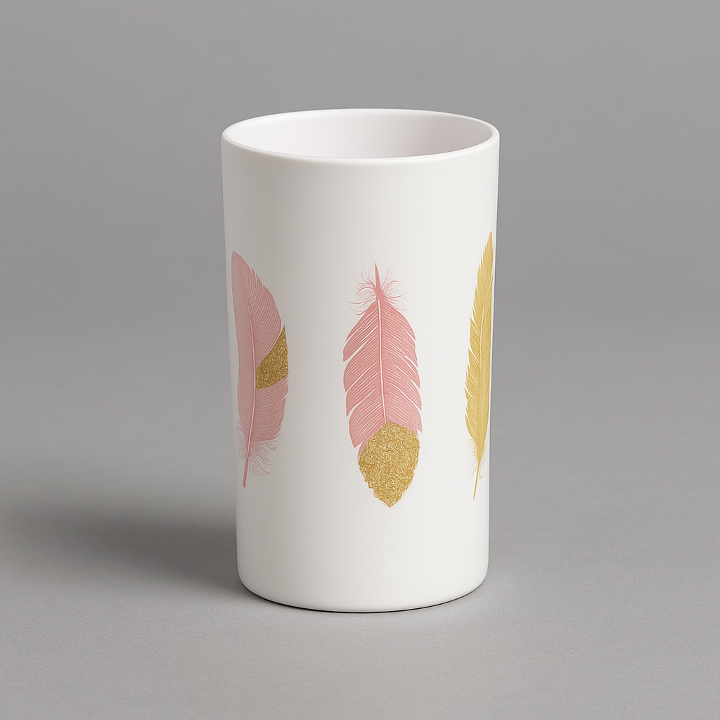 Bicchiere della serie amazzonia, realizzato in ceramica resistente con elegante decorazione a piume colorate. Ideale come portaspazzolino o contenitore multiuso per il bagno, dona un tocco naturale e raffinato all’arredo.